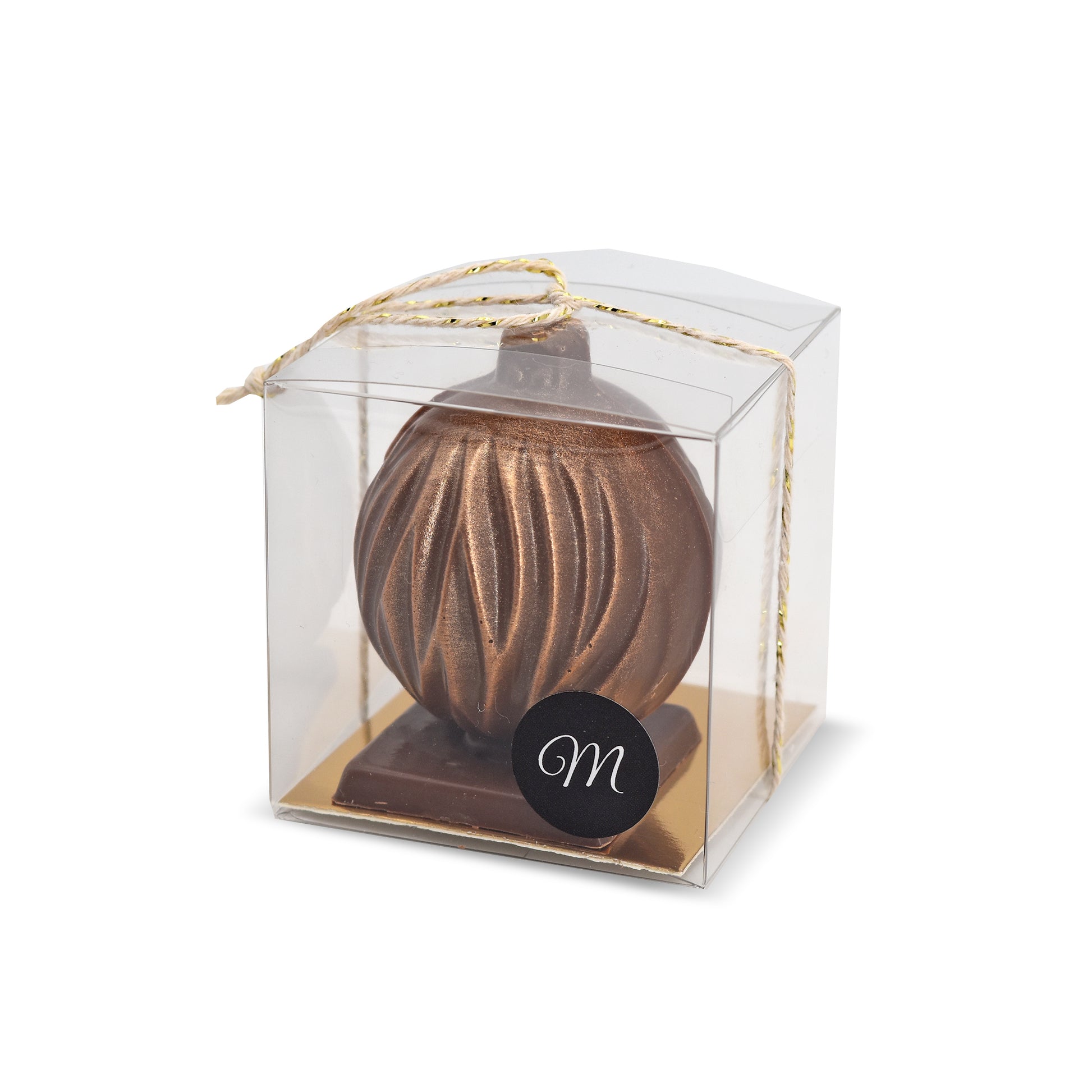 Une boule de Noël en chocolat au lait, à suspendre dans le sapin ou à croquer tout de suite.