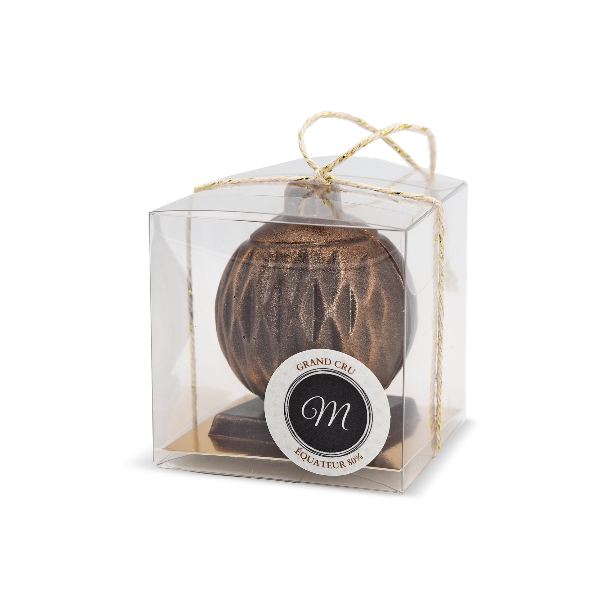 Une boule de Noël en chocolat noir 80% pour les amateurs de plaisirs intenses, à suspendre dans le sapin ou à croquer tout de suite.