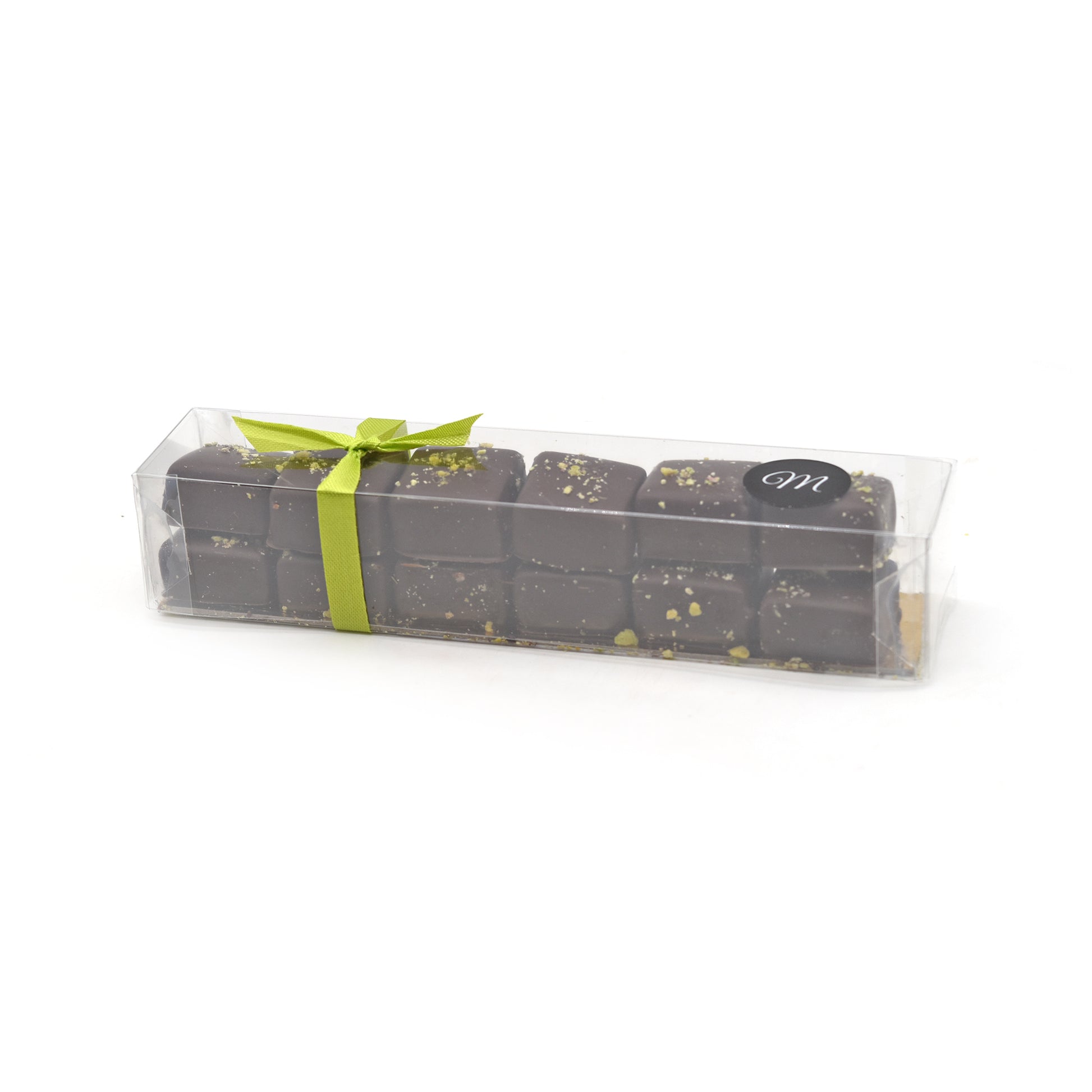 Carrés pralinés maison aux éclats de pistaches enrobés de chocolat noir