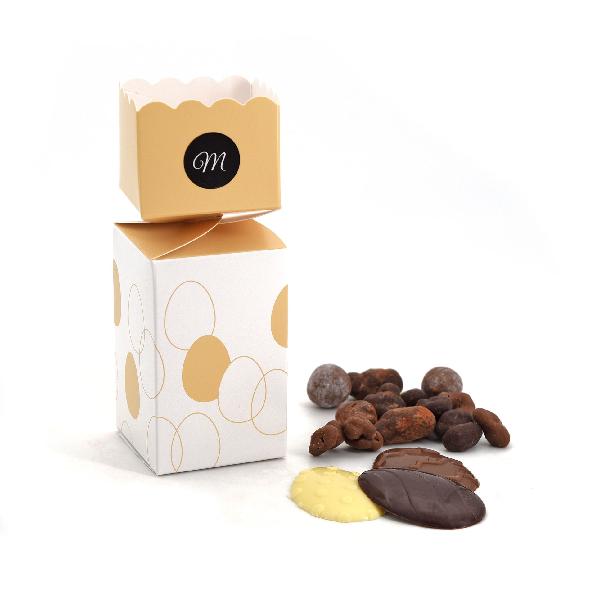 Un Cracker renfermant un assortiment d'amandes, noisettes, pistaches et noix de pécans, caramélisées et chocolatées, et des petits œufs de Pâques plats assortis.