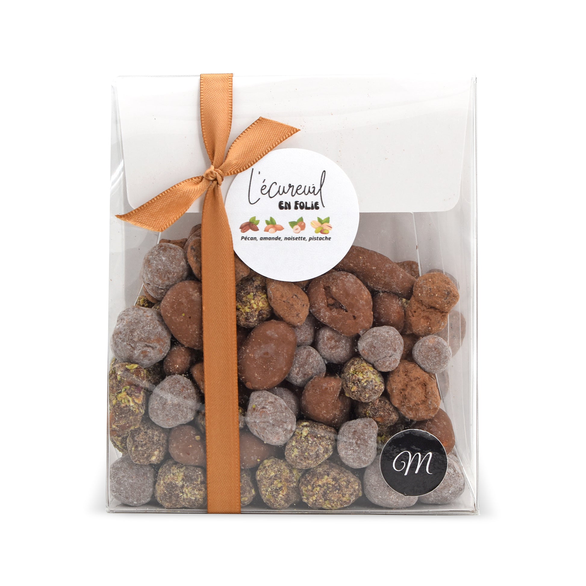 Ingrédients : Amandes*, Pistaches*, Noisettes*, Noix de pécan*, chocolat noir (pâte de cacao*, sucre de canne*, beurre de cacao*) chocolat lait (sucre de canne*, beurre de cacao*, poudre de lait*, pâte de cacao*, lécithine de tournesol*, vanille*), sucre de canne*, cacao en poudre*, sucre glace*.
