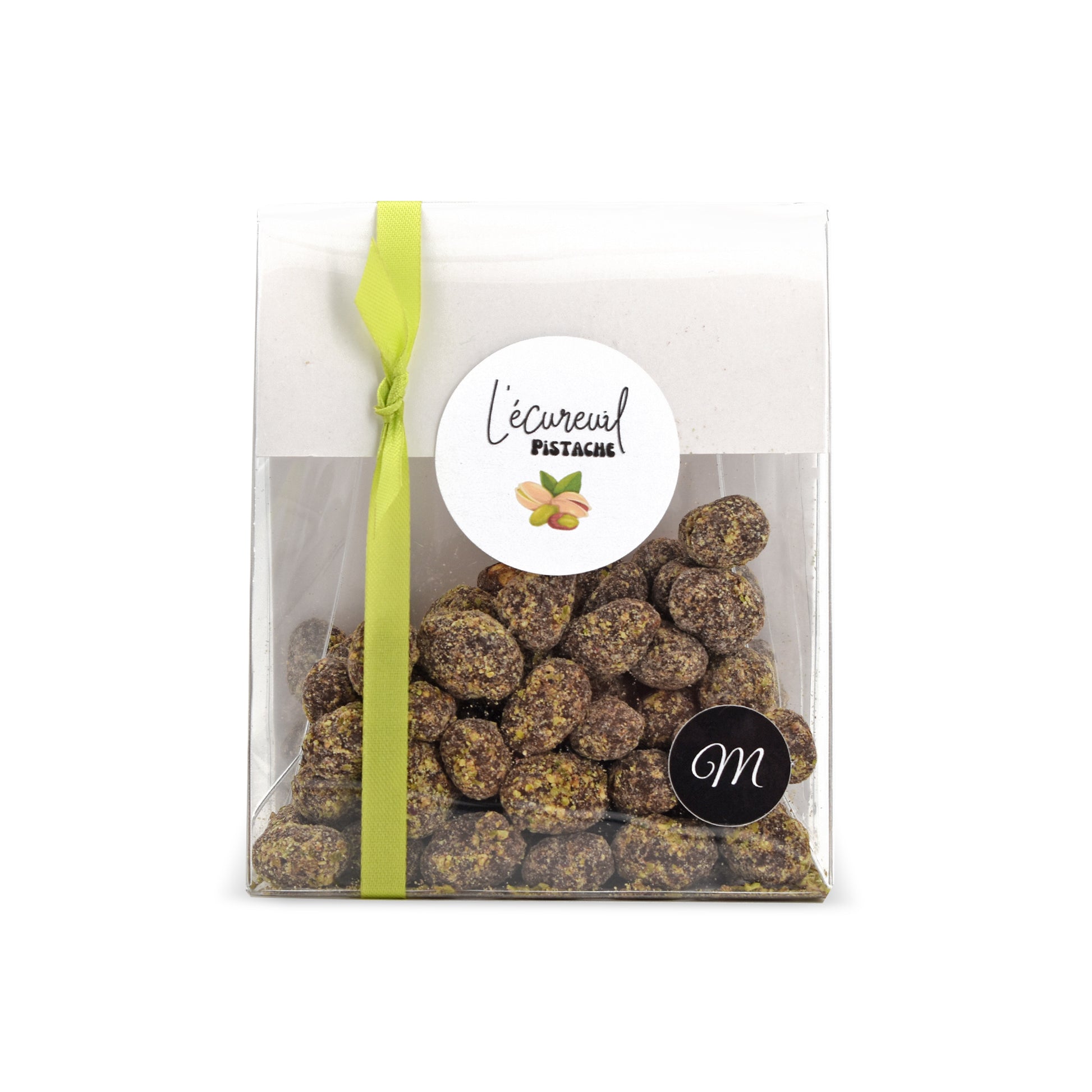 Ingrédients : Pistaches*, chocolat noir (pâte de cacao*, sucre de canne*, beurre de cacao*), sucre de canne*, eau, cacao en poudre*.