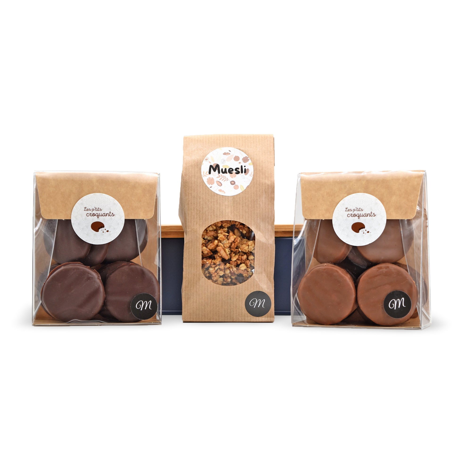 Deux boîtes de petits biscuits sablés amande délicieusement recouvert d'une couche de chocolat au lait (ou chocolat noir) croquante, et un sachet de muesli.