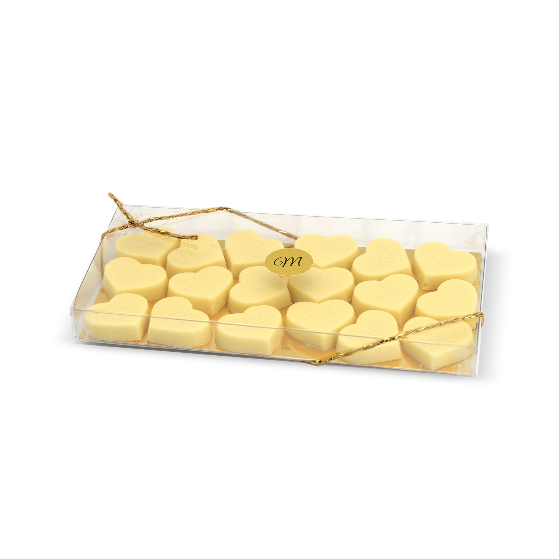 18 cœurs en chocolat qui disent "Je t'aime" dans toutes les langues.