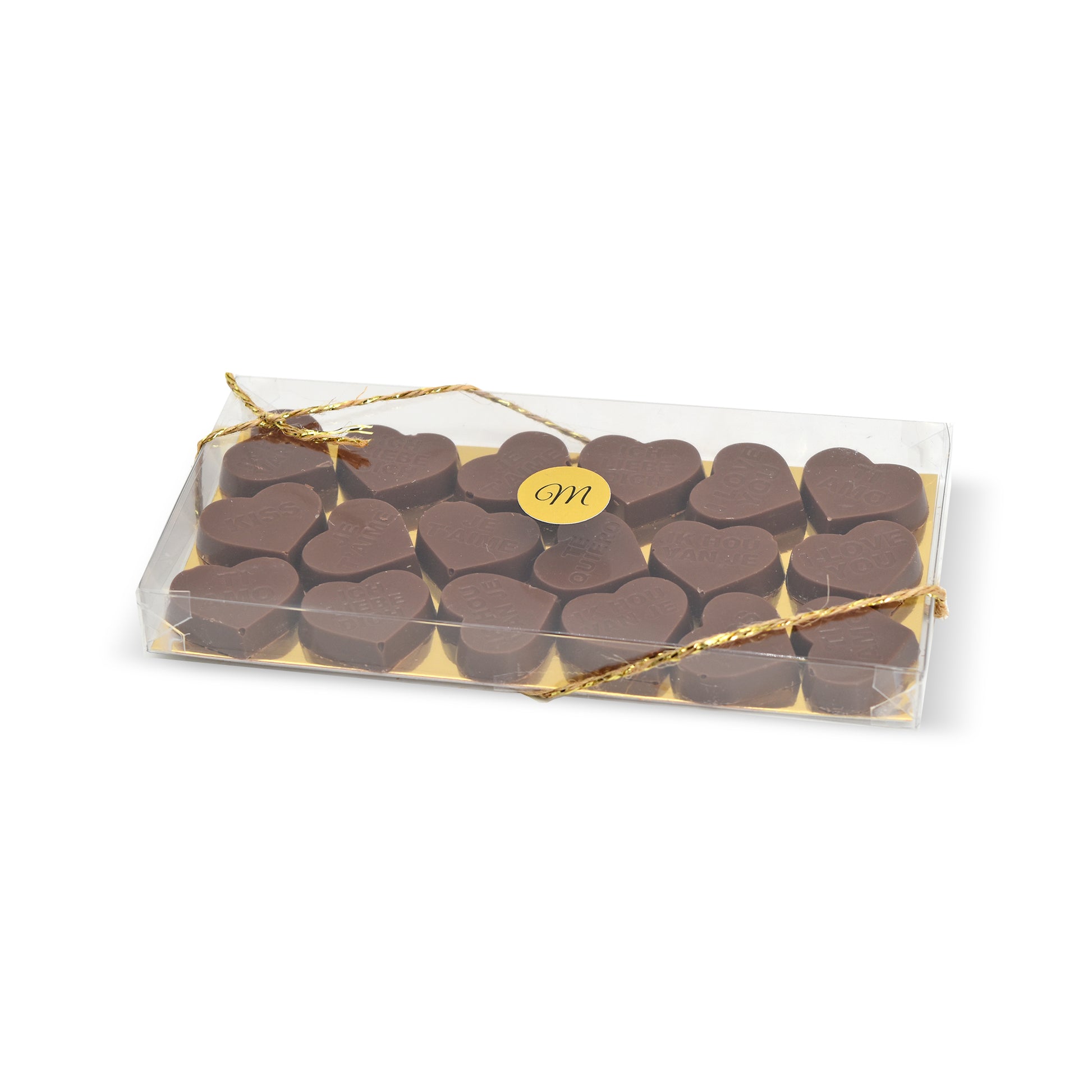 18 cœurs en chocolat qui disent "Je t'aime" dans toutes les langues.