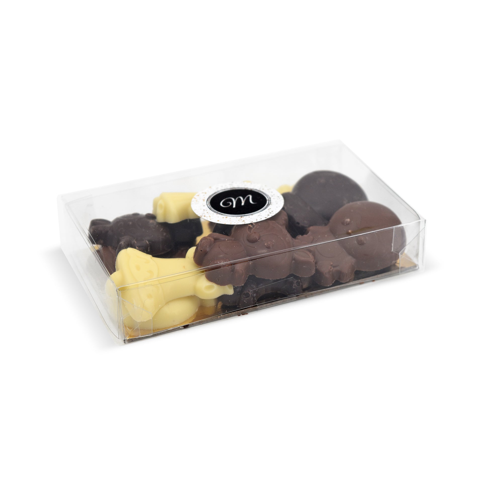 Ingrédients : Chocolat noir* (pâte de cacao* 58%min, sucre canne*, beurre cacao*). Chocolat lait* (sucre canne*, beurre cacao*, poudre lait*, pâte de cacao* 37%min, lécithine tournesol*, vanille*). Chocolat blanc* (sucre canne*, beurre cacao*, poudre lait*, lécithine tournesol*, vanille*).