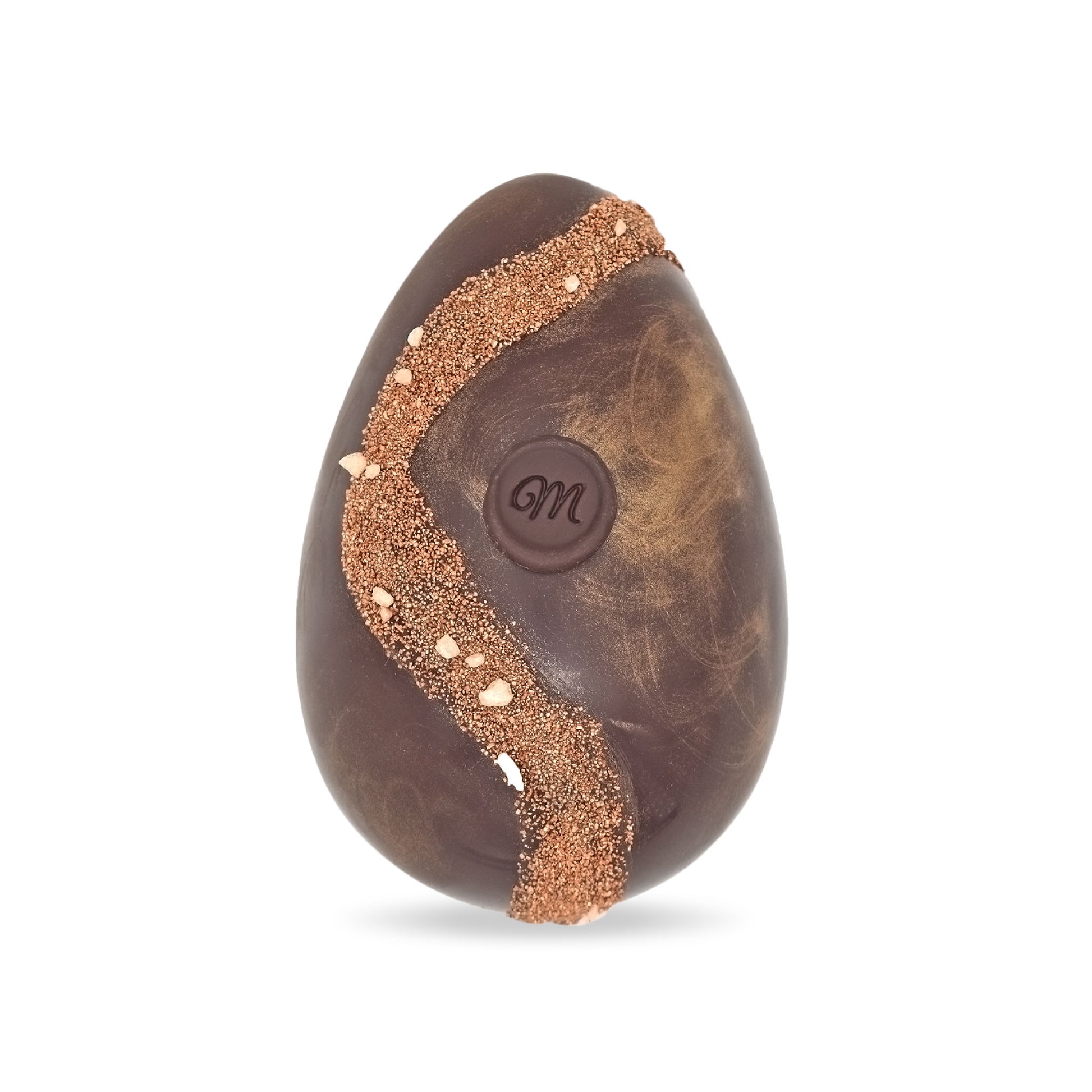 Un œuf au chocolat noir, renfermant des œufs pralinés, des petits moulages en chocolat et des billes soufflées chocolatées.