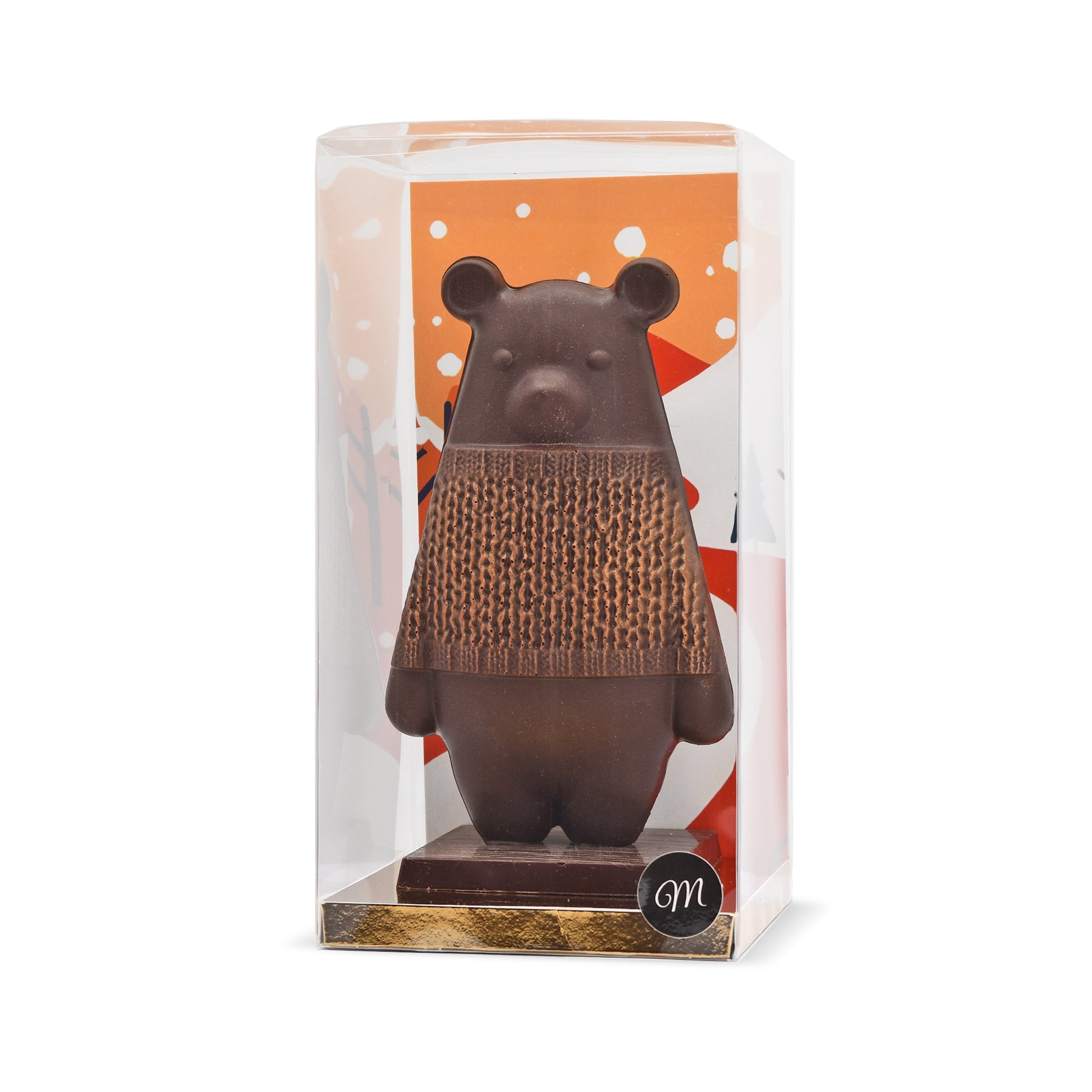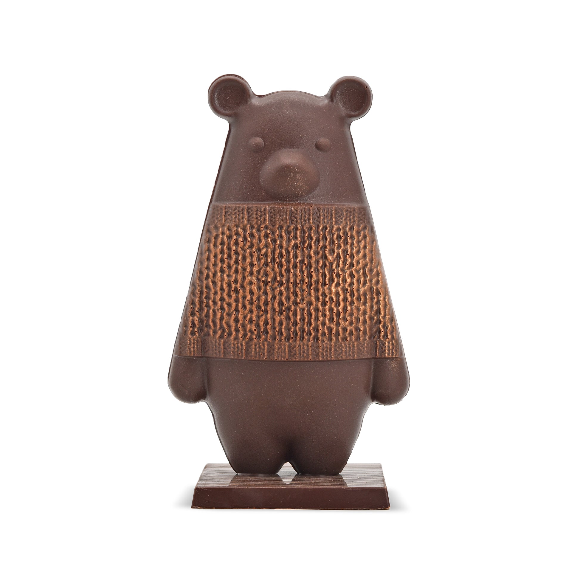 Notre ours en chocolat noir et son pull en cho-coton 100% bio, garni de Crousti Choc (billes soufflées chocolatées).