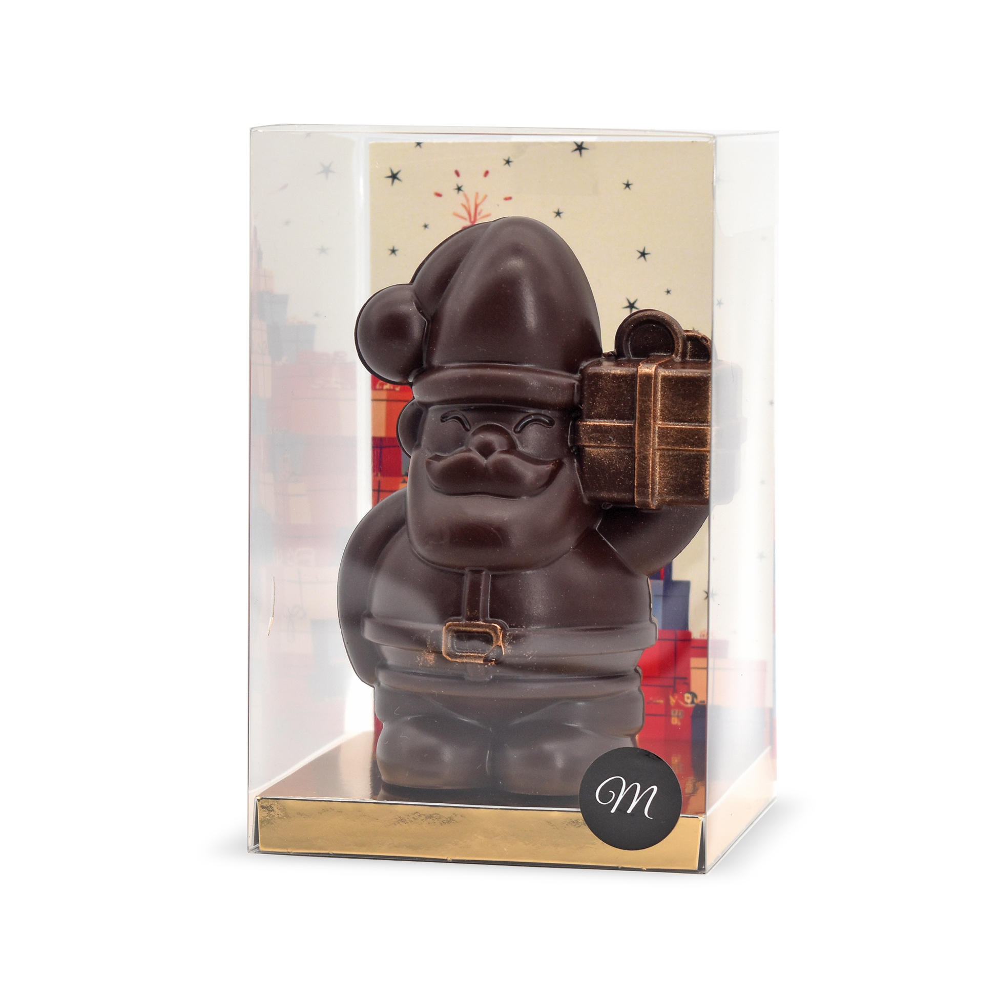 Vous n'y croyez plus ? Essayez le en bio : le père Noël en chocolat noir, garni de Crousti Choc (billes soufflées chocolatées).