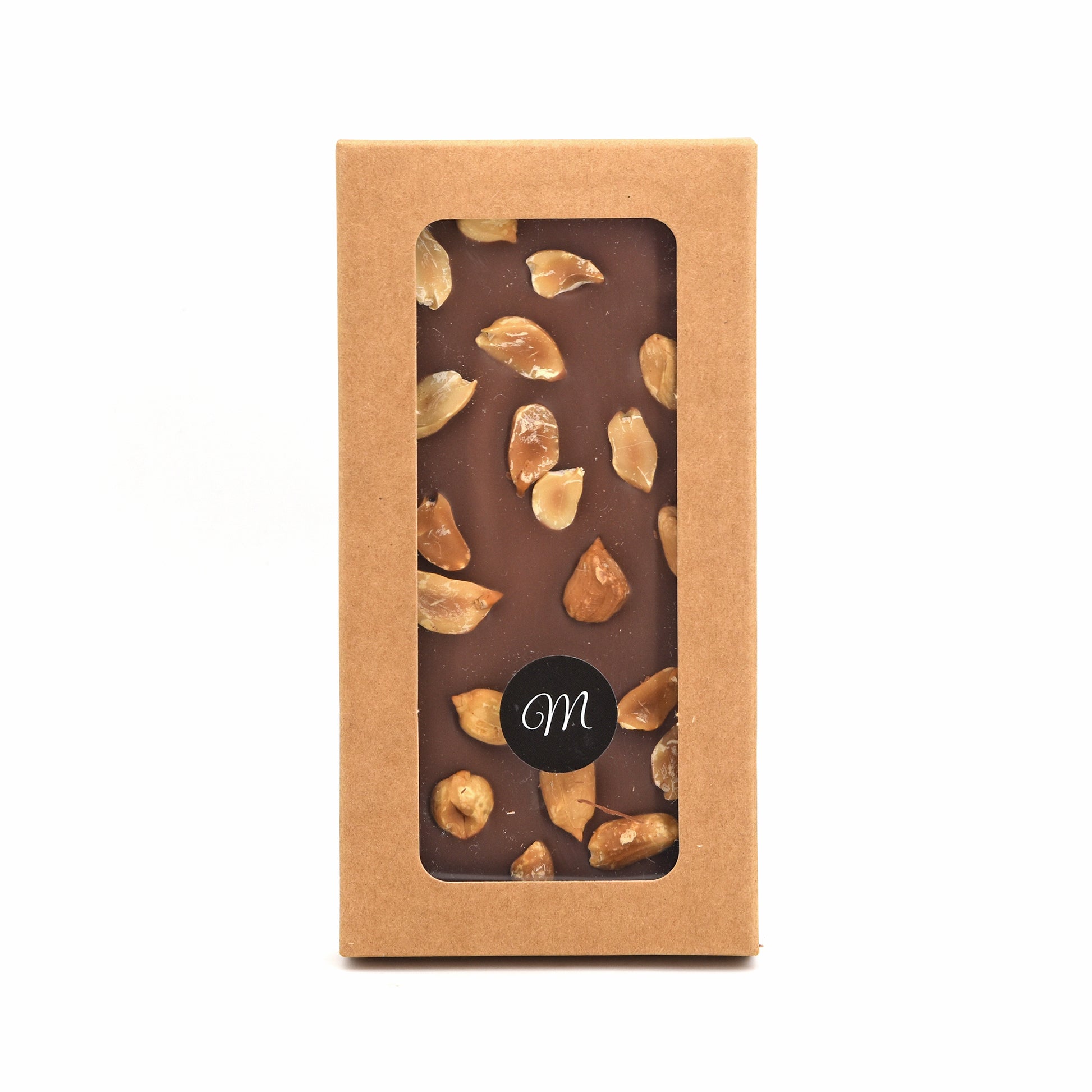 Ingrédients : Sucre de canne blond*, beurre de cacao*, poudre de lait*, pâte de cacao 37% min Rep.Dominicaine*, lécithine de tournesol*, extrait de vanille*, cacahuètes*.