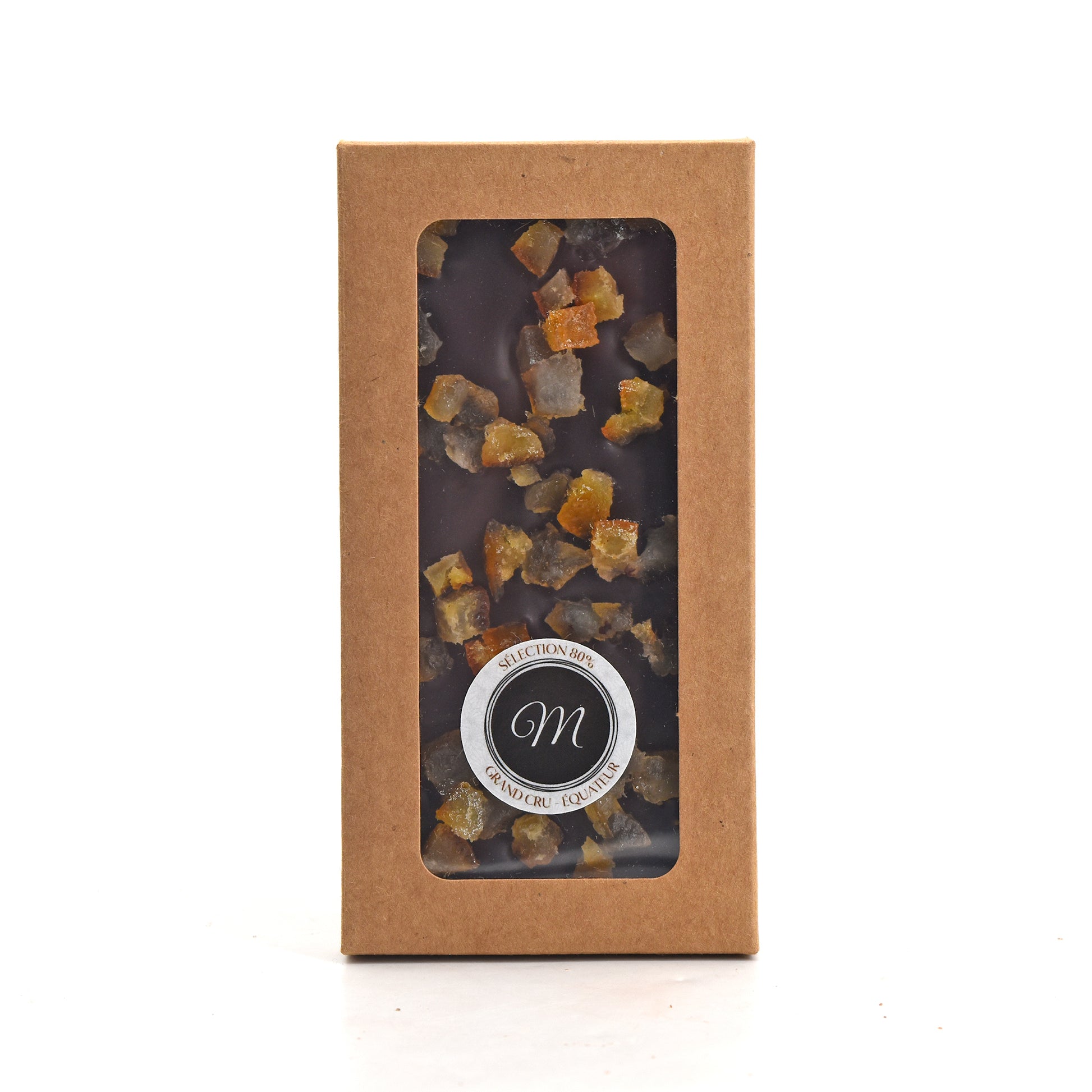 Ingrédients : Pâte de cacao Équateur* 80% min, sucre de canne*, orange*, citron*