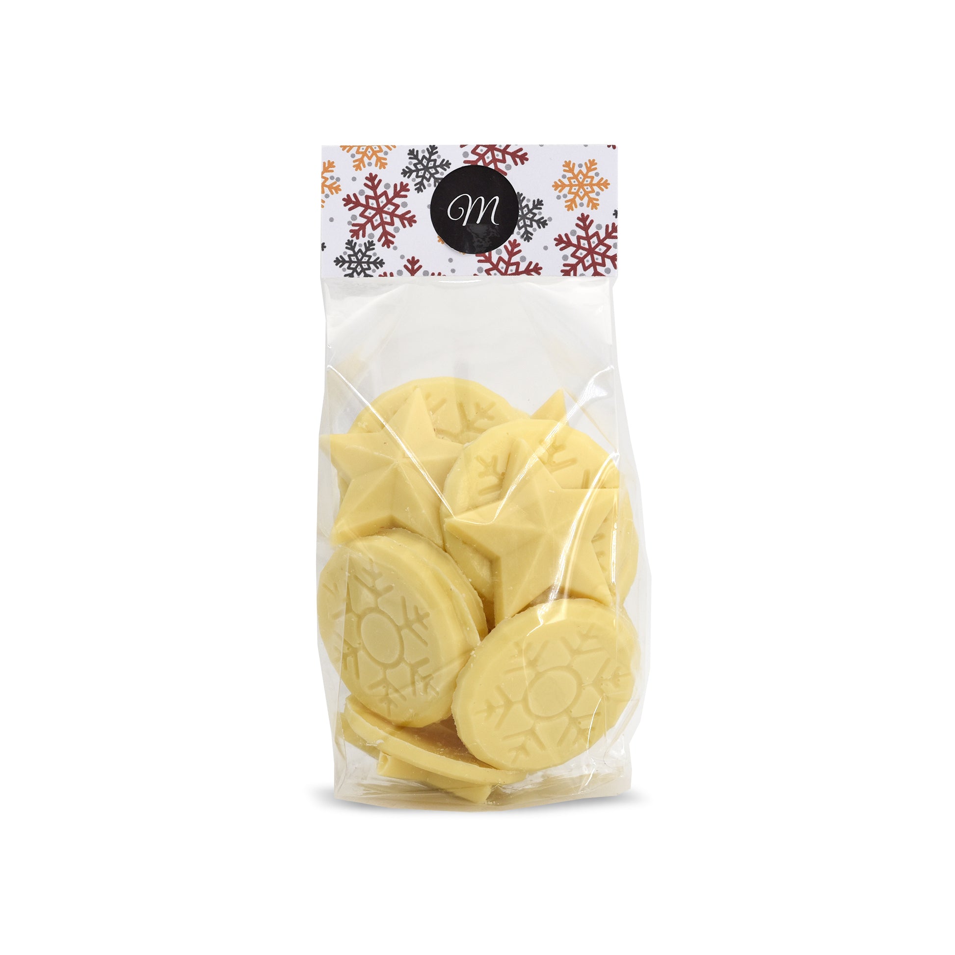 Une tempête de flocons et étoiles en chocolat blanc dans un sachet.